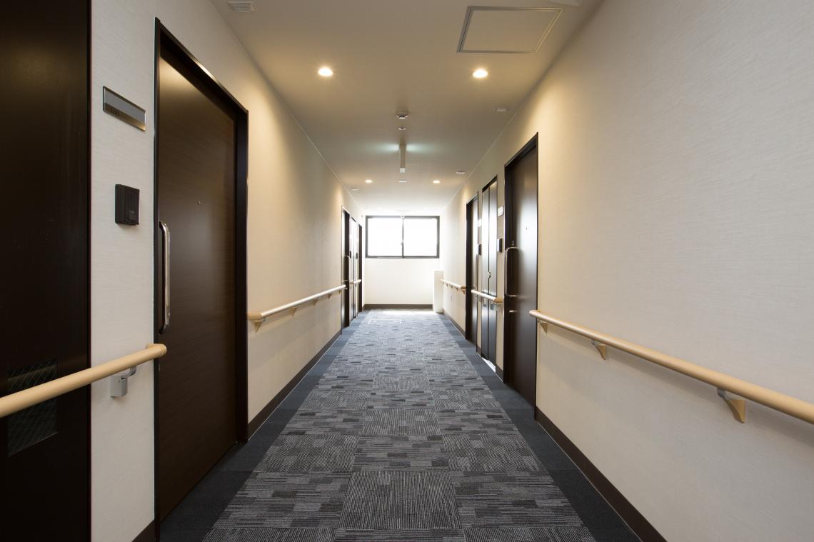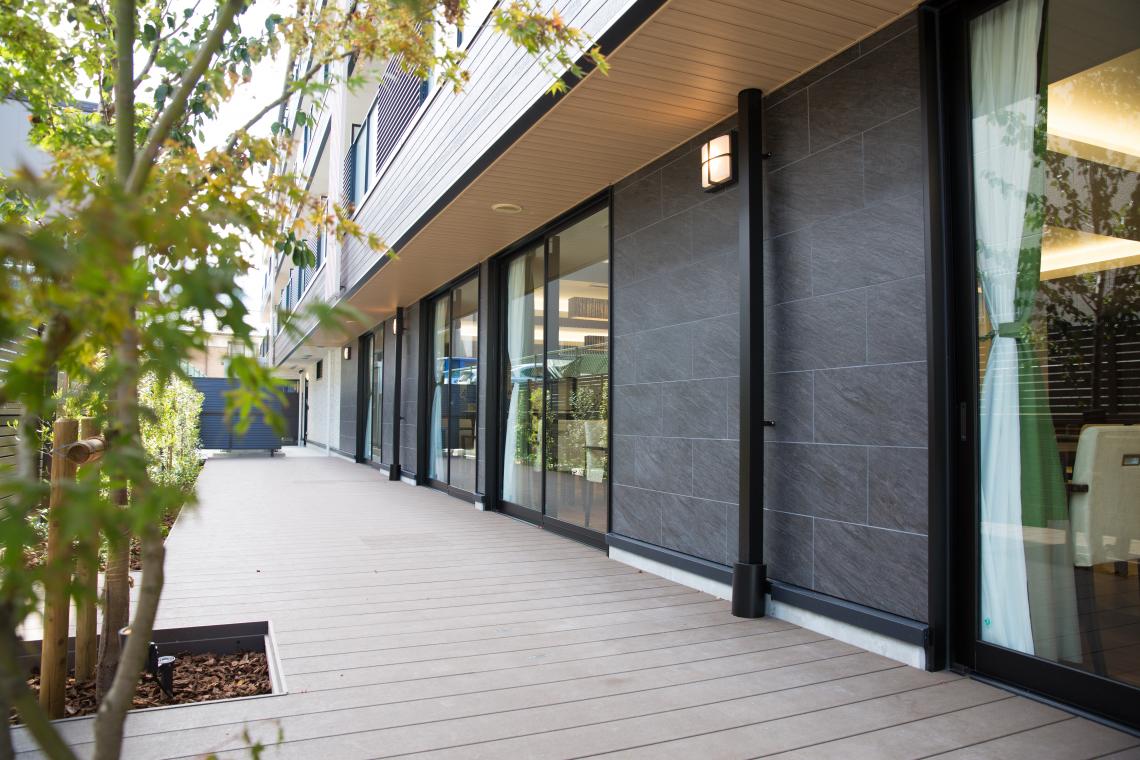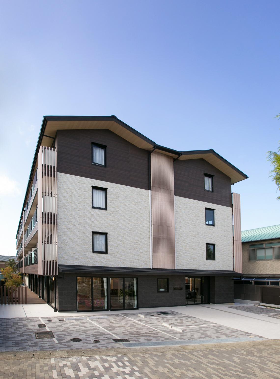S造4階建てサービス付き高齢者向け住宅です。落ち着きのある外観で、軒天やルーバーの木目が印象的です。K型フレーム構法という鉄骨ブレース構造で、梁型や柱型が居住空間に出てきません。