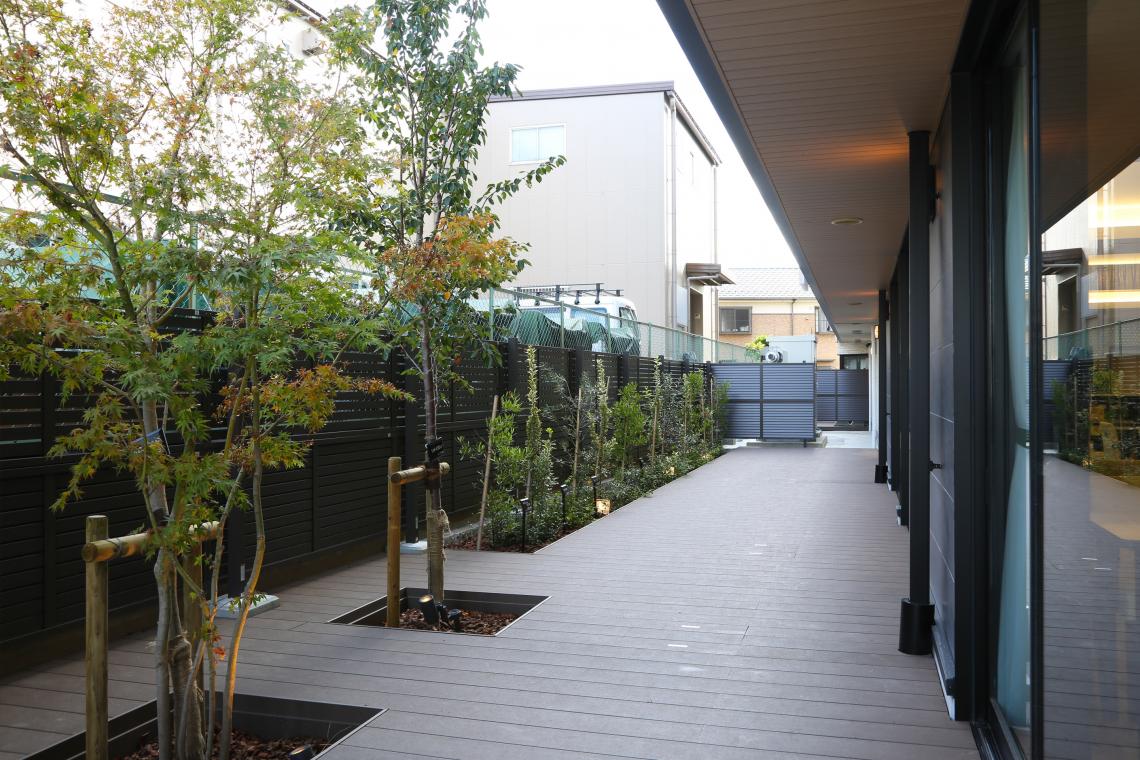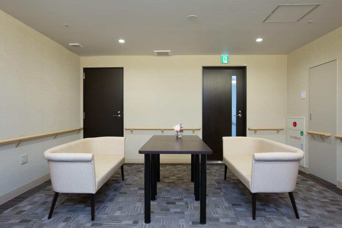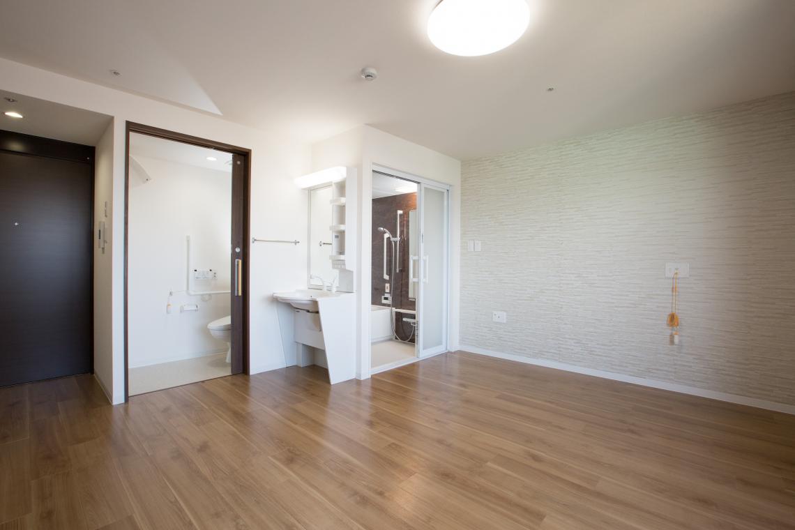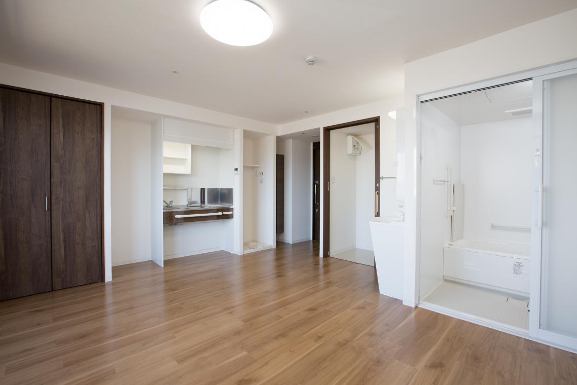 S造4階建てサービス付き高齢者向け住宅です。落ち着きのある外観で、軒天やルーバーの木目が印象的です。K型フレーム構法という鉄骨ブレース構造で、梁型や柱型が居住空間に出てきません。