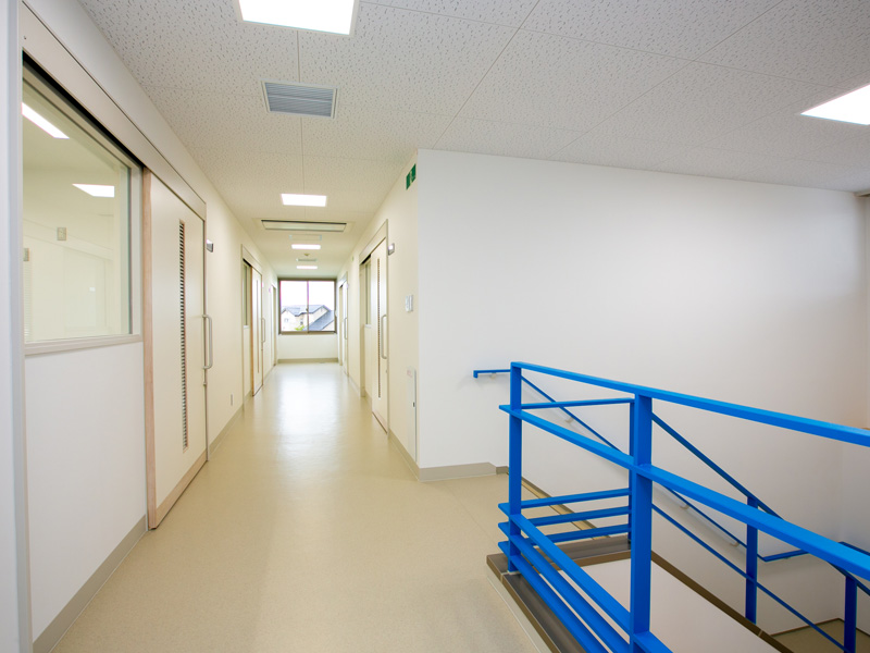 既存棟の外観イメージに合わせ、石状の吹き付け塗装を施し曲線状の屋根の形をした建物です。内装は薬物に対応した内装材で仕上げてあります。