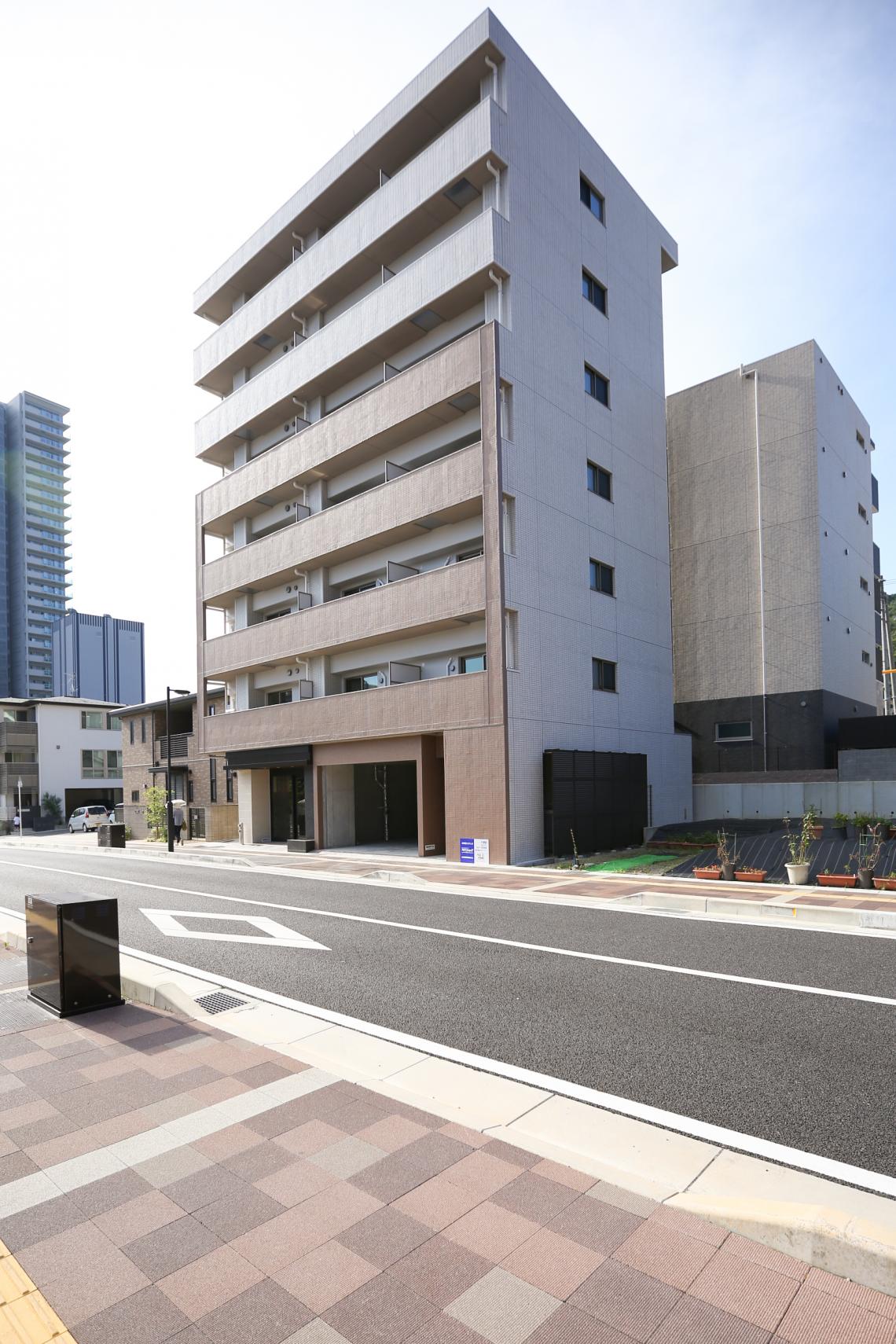 RC造7階建て店舗付き賃貸マンションです。外観は清潔感のある白と温かみのある茶色の配色。また安心・安全なセコムによるセキュリティと重厚感のエントランスが特徴です。
