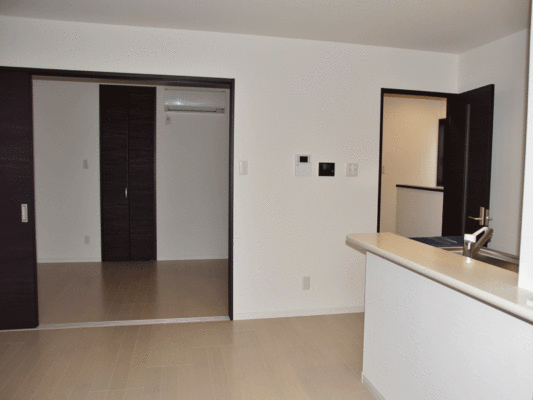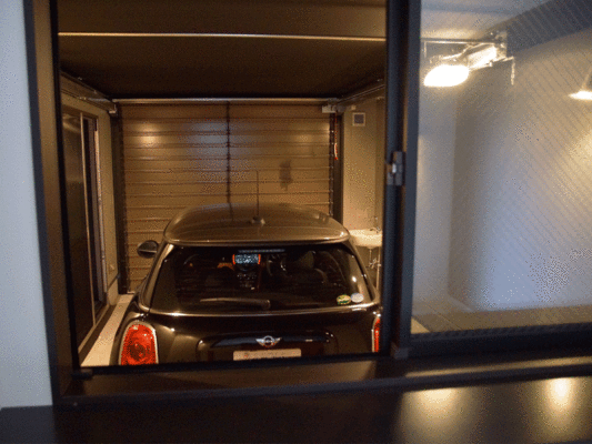 ガレージのシャッターは無線リモコンでも操作ができ、玄関と引き戸で繋がっているので、雨の日でもスムーズに車を出すことができます。