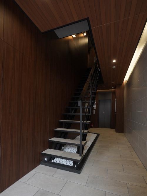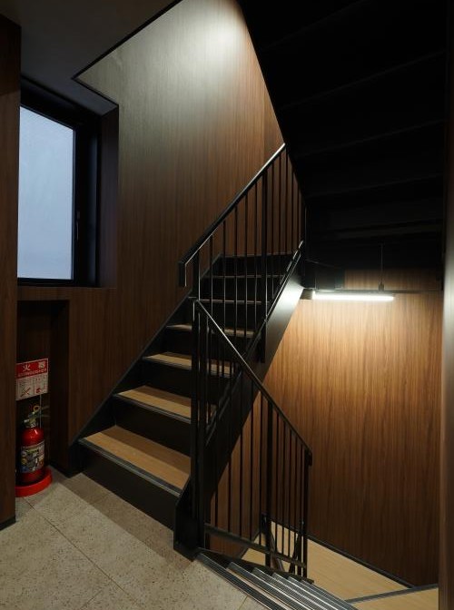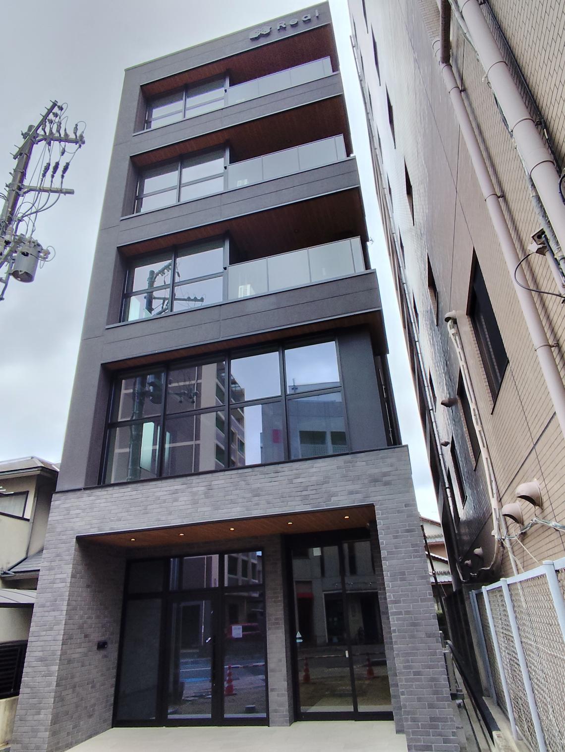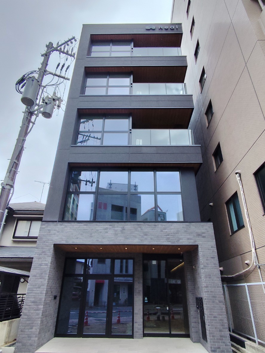 守山駅近くの狭小地の物件で、S造5階建て店舗付賃貸マンションです。1階は店舗、2階は事務所、3~5階が住戸になっています。外観は黒メイン・内部共用部分は木目調のオーナー様こだわりの外装になっています。